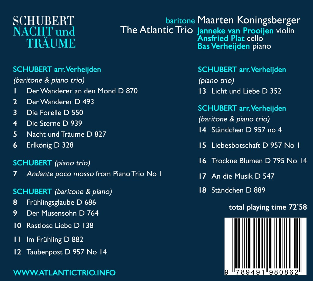Nacht und Träume – a Schubert recital for baritone and piano trio! Brand new arrangements by our pianist Bas Verheijden, bringing out unexpected colours in these magnificent Lieder. The program is introduced by the singer and features songs like Nacht und Träume, Die Sterne, Nachtstück, Ständchen, Der Wanderer, An die Musik and Erlkönig. The icing on the cake is the magnificent Notturno in E-flat major Opus 148 for piano trio.